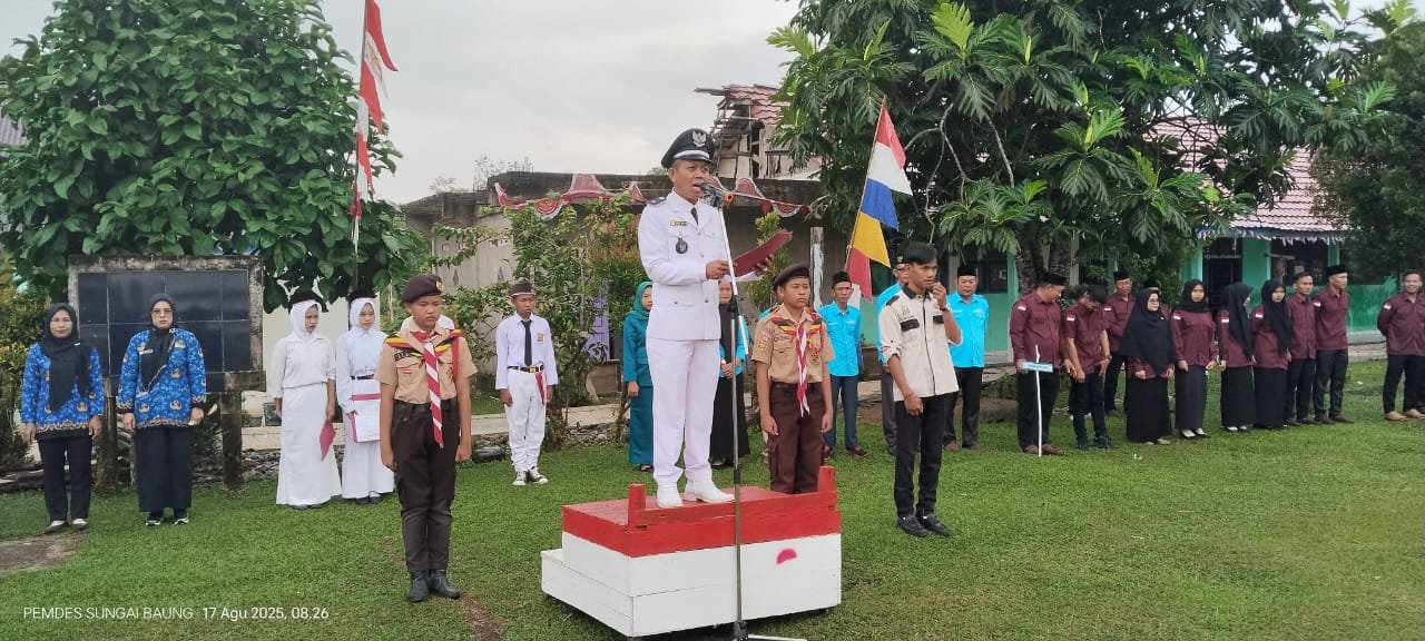 Murexs.com, Muratara – Kepala Desa (Kades) Sungai Baung Abdul Hallik ,kecamatan Rawas Ulu ,kabupaten Musi Rawas Ulu. Mengikuti Upacara Apel Bendera Memperingati Hari Kemerdekaan Republik Indonesia yang ke 80, dalam hal ini beliau sebagai Instruktur Upacara yang diadakan di Lapangan Sekolah Mts.Almanshuria, Minggu (17/8/2025).